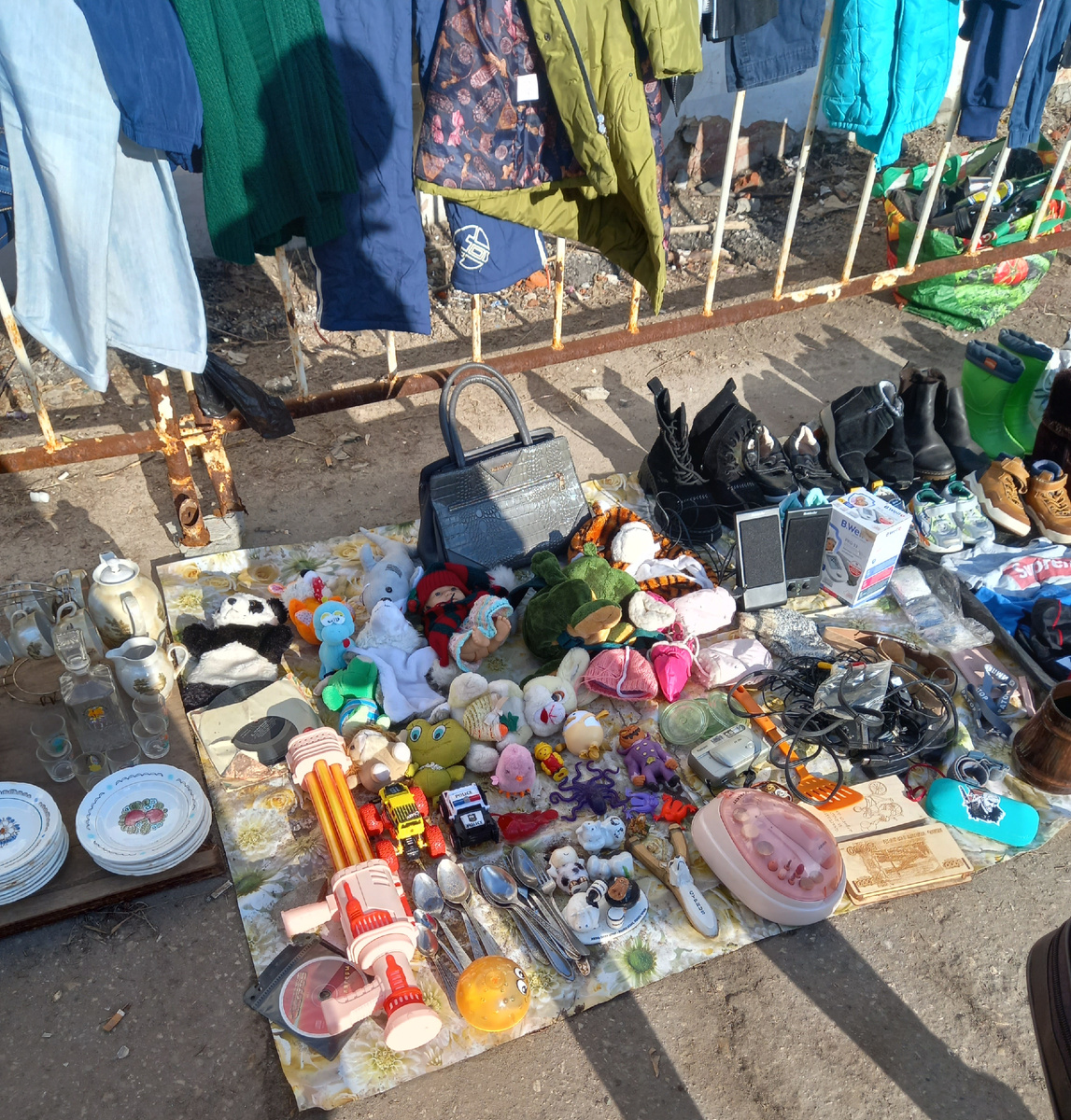 Привет! В выходной день , еще и с прекрасной погодой , надо прогуляться на барахолку. Айда со мной😉 Сегодня довольно много игрушек. Это радует. Нравится их рассматривать. Продаются даже лаки для ногтей б/у и кремы 👇 Такую настольную Советскую лампу мама недавно выбросила на помойку. Видела бы она что похожая продаётся🤭 Цену уж не стала спрашивать , чтобы не расстраиваться. Немного куколок , но они простенькие . Не выбрала никого. Вазу с рисунком гжель рассмотрела только после . Дома, на фото. Приценилась бы. Почему-то в доме нет вазы. Хрустальная недавно лопнула . Потом появилась небольшая кручёная стеклянная оранжевая. А вдруг , неожиданно дома окажется большой букет🤭 Надо быть готовой))) Тут настоящие раритеты. Статуэтки, ёлочные игрушки, машинки. Немного, но интересно. Коллекции монет, знаков, значков. А здесь похоже вещи с копа. Пожалуй, наиболее представляющие интерес для коллекционеров. Да хоть в музей такие. Веретено увидела ни сразу. Стоит так застенчиво в сторонке