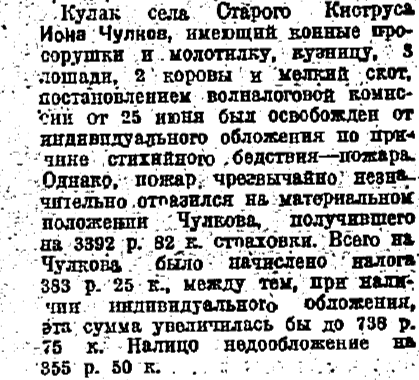 Листаю подшивку газеты «Рабочий путь» за 1929 год. В номере от 2 ноября 1929 года товарищи рабкоры возмущаются недообложением кулацкого элемента в бывшей Спасской волости. Кого же считали кулаками на закате НЭПа в рязанских краях? Вот например: «..Кулак села Старого Киструса Иона Чулков, имеющий конные просорушки и молотилку, кузницу, лошади, 2 коровы и мелкий скот, постановлением волналоговой комиссий от 25 июня был освобожден от индивидуального обложения по причине стихийного бедствия - пожара. Однако, пожар чрезвычайно незначительно отразился на материальном положении Чулкова, получившего на 3392 р. 82 к. страховки. Всего на Чулкова было начислено налога 383 р. 25 к., между тем, при наличии индивидуального обложения, эта сумма увеличилась бы до 738 р. 75 к. Налицо недообложение на 355 р. 50 к….» У человека сгорело хозяйство. Тем не менее ретивые товарищи требуют обложить его налогом по полной программе, как будто все имеется в наличии. И это при том, что даже страховщики признали вы
