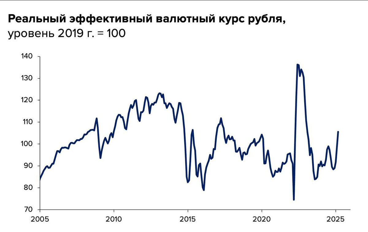 Курс рубля, который вы видите в обменнике, далеко не всегда отражает его реальную стоимость. Даже если рубль к доллару остается стабильным, инфляция может значительно изменить покупательную способность валюты. Для оценки этого эффекта используется показатель REER — реальный эффективный валютный курс. Что такое REER? Реальный эффективный валютный курс (REER) — это, по сути, объективный взгляд на рубль. Он показывает, насколько рубль дорог или дешев относительно валют основных торговых партнеров, но с учетом разницы в инфляции между странами. То есть REER — это инструмент, который действительно помогает оценить конкурентоспособность экономики. Как рассчитывается REER? 1️⃣Берется корзина валют стран — основных торговых партнеров. 2️⃣Считается номинальный курс (NEER) — средневзвешенное значение рубля по отношению к этим валютам. Это показатель прямого курса, т. е. чем выше NEER, тем крепче отечественная валюта (например, прямой курс рубля к доллару сейчас около 0,012). 3️⃣NEER корректирует