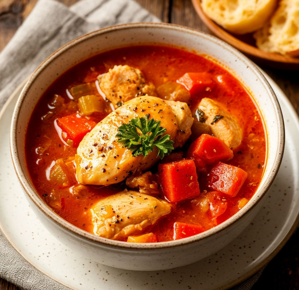 200-250г мяса домашней птицы, ( курицы, индейки, гуся или утки), 10г жира, 15г репчатого лука, 10г моркови, 5г петрушки и сельдерея (корни), 10г томатной пасты, 10г сливочного масла, 5г пшеничной муки, 25г сметаны, соль, перец. Домашнюю птицу порезать кусочками, положить на сковороду и обжарить на жире, затем переложить в кастрюлю, залить кипятком или бульоном, добавить томатную пасту и тушить 30 минут. Добавить нарезанные соломкой и обжаренные на масле ароматические коренья, соль, перец и тушить до готовности. Готовое мясо положить в глубокую посуду и залить соусом, приготовленным из жидкости, в которой тушилась мясо и к которой добавлена пассированная мука, смешанная со сметаной. Гарнир: отварной или жареный картофель, тушёные овощи или салат из свежих овощей.