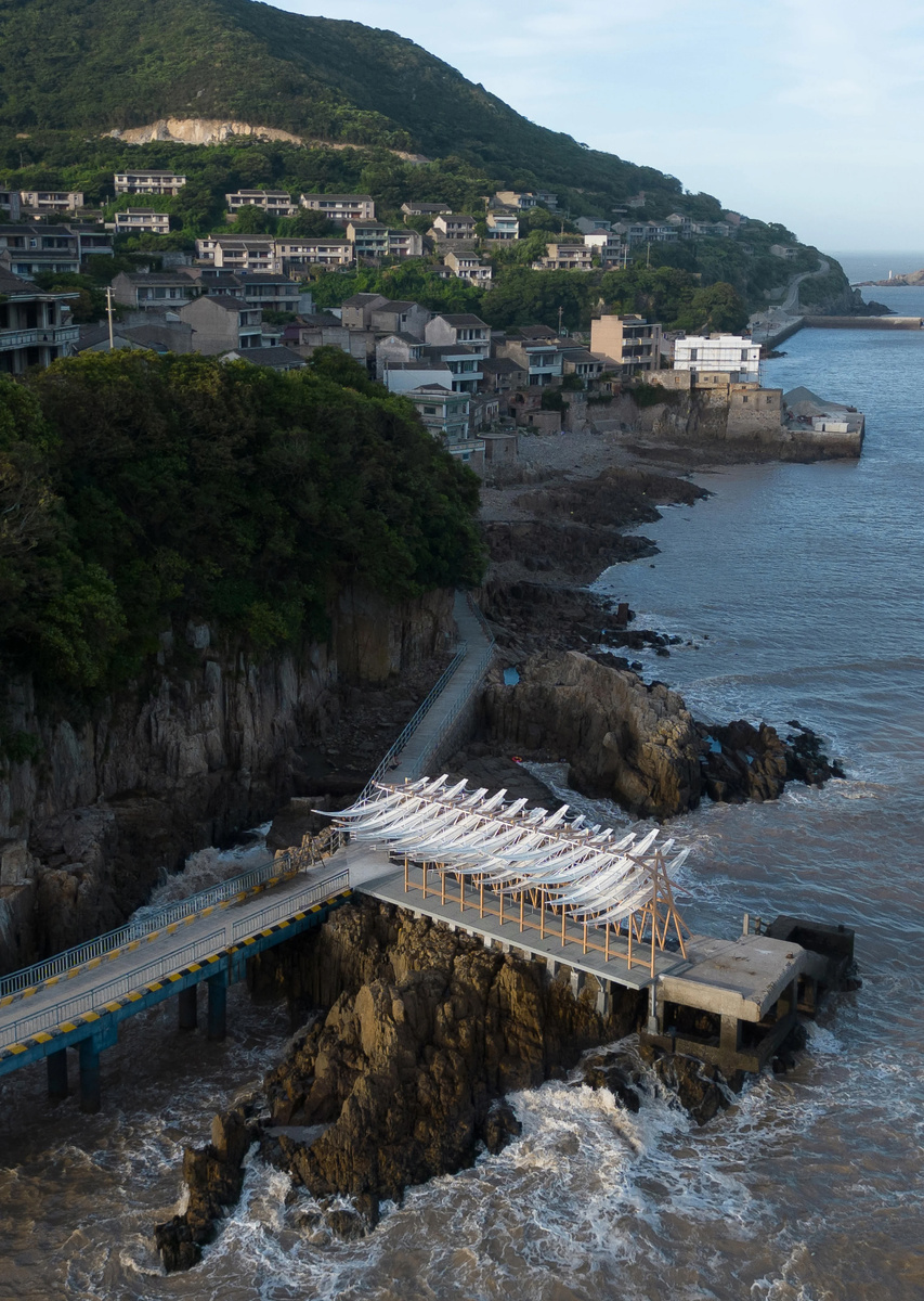 Жил-был остров где-то в Южно-Китайском море. На острове жили рыбаки. Каждую ночь они уходили в море, добывали улов, продавали на материк и возвращались обратно. Но мир изменился и никому уже не нужна рыба. Рыбаком быть теперь не модно. Стало модно ходить в белом воротничке с чемоданом и очень важным видом. Население острова схлынуло, оставив за собой город-призрак и популяцию из восьмидесяти стариков. Каждый человек подобен острову, поэтому не спрашивайте меня по ком звонит колокол... Правительство решило произвести репопуляцию. То есть привлечь население обратно на остров. Оживить заброшенное место, снова сделать его привлекательным. Поэтому начало застройку острова новыми объектами. Там где раньше был рыбацкий бетонный пирс, который отжил своё, возникла вот такая станция, на которую прибывают лодки с туристами с материка. Это одновременно визуальный ориентир, арт-объект и беседка, спасающая от солнца. Наверное, даже больше - это символ возрождения умирающего места. С одной стороны, э