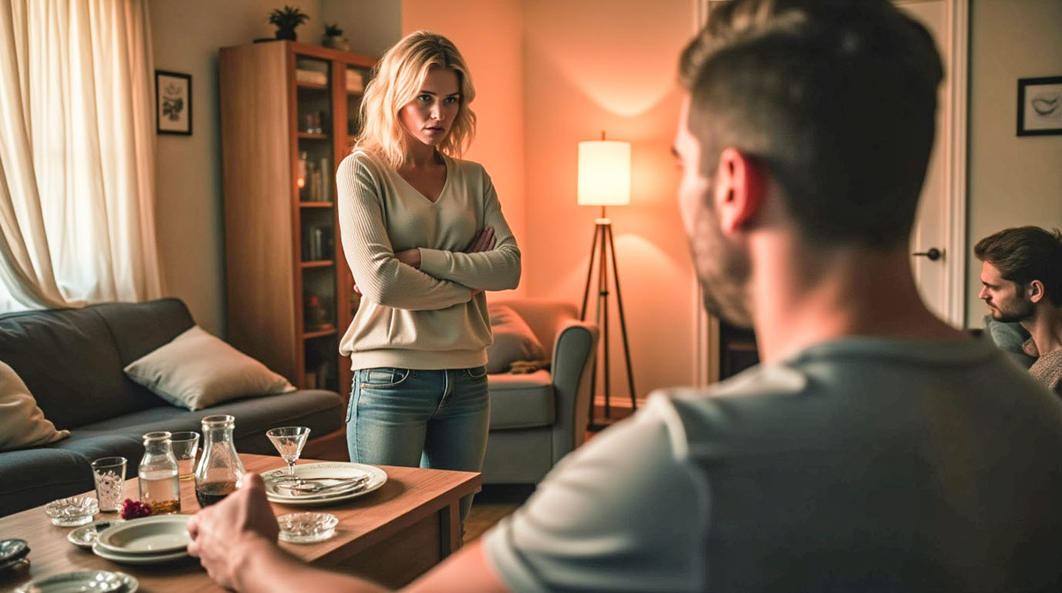 В прихожей раздались необычные звуки — то ли шаги, то ли приглушенные голоса. Алена напряглась. В квартире кто-то был. Она осторожно заглянула в комнату и увидела двоих мужчин, расположившихся на диване с банками пива. Один из них — ее муж Костя, другой — незнакомый бородатый парень.