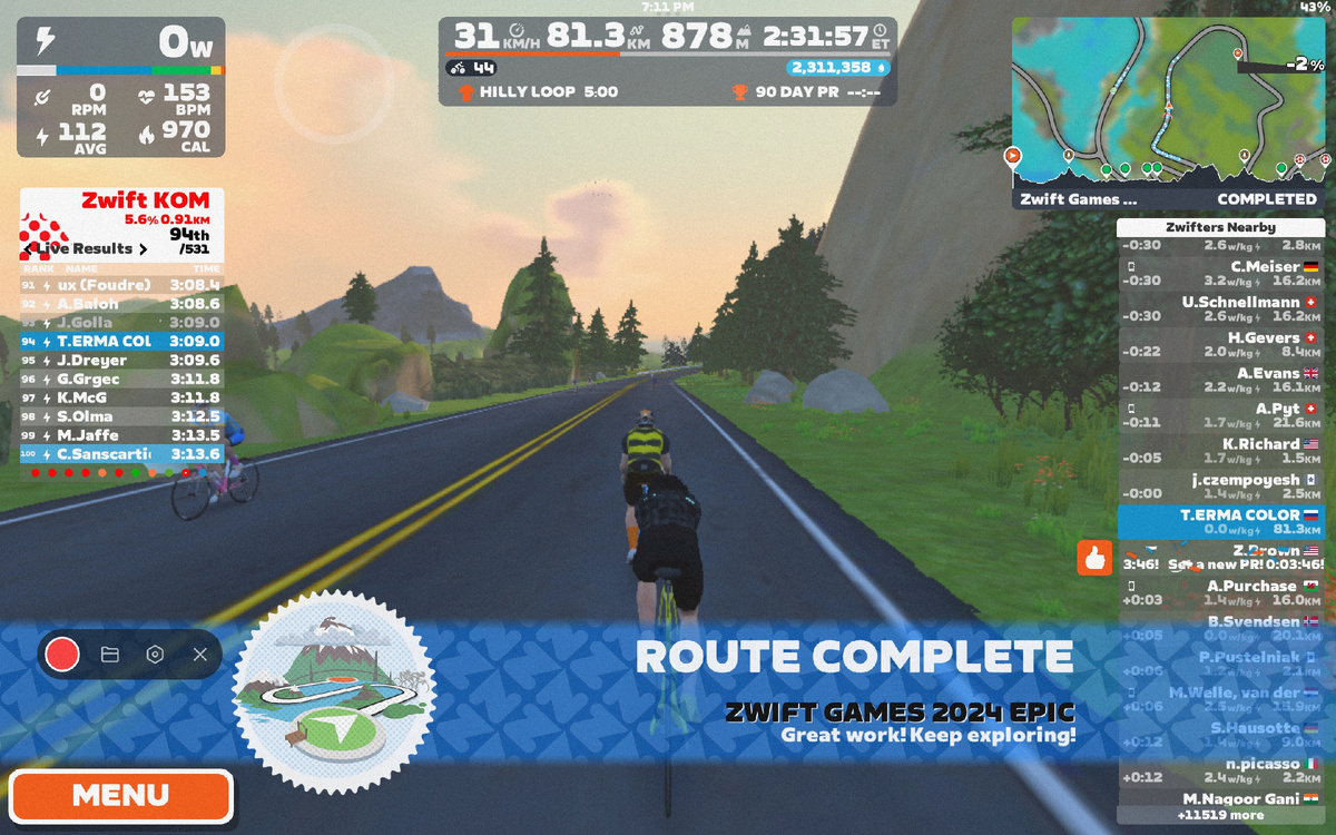 Сегодня в качестве очередной тренировки была выбрана трасса Zwift Games 2024 Epic протяженностью 81,3 километра с общим набором высоты 878 метров. На преодоление этого маршрута ушло 2,5 часа. Раньше я не видел этот маршрут в перечне доступных. Видимо он новый, и посвящён завершению 2024 года. Хорошая идея организаторов. Они не сидят сложа руки, и постоянно придумывают что то новое и интересное.