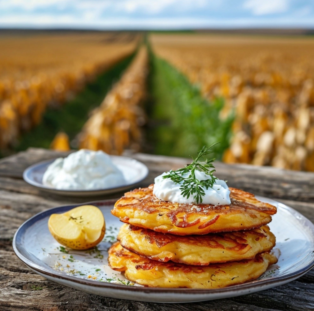 - Подавать драники горячими со сметаной. По желанию в сметану можно добавить мелко нарезанную зелень, пропущенный через пресс чеснок, соль и специи