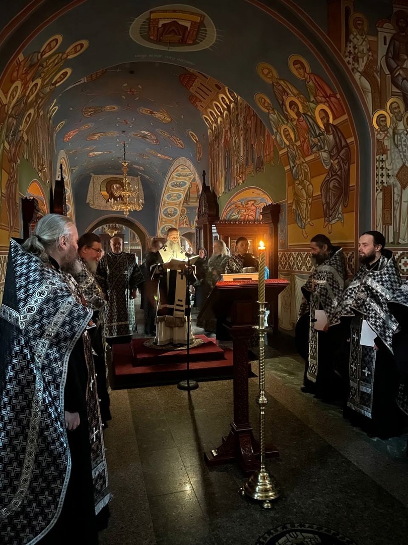Владыке сослужили игумен Виталий (Уткин), иеромонах Макарий (Маркин), иерей Владимир Сербиненко, иеромонах Феофан (Наумов), иерей Михаил Куприянов, иерей Георгий Алексеев, протодиакон Павел Коник, иеродиакон Авксентий (Фокин) и диакон Сергий Белов.