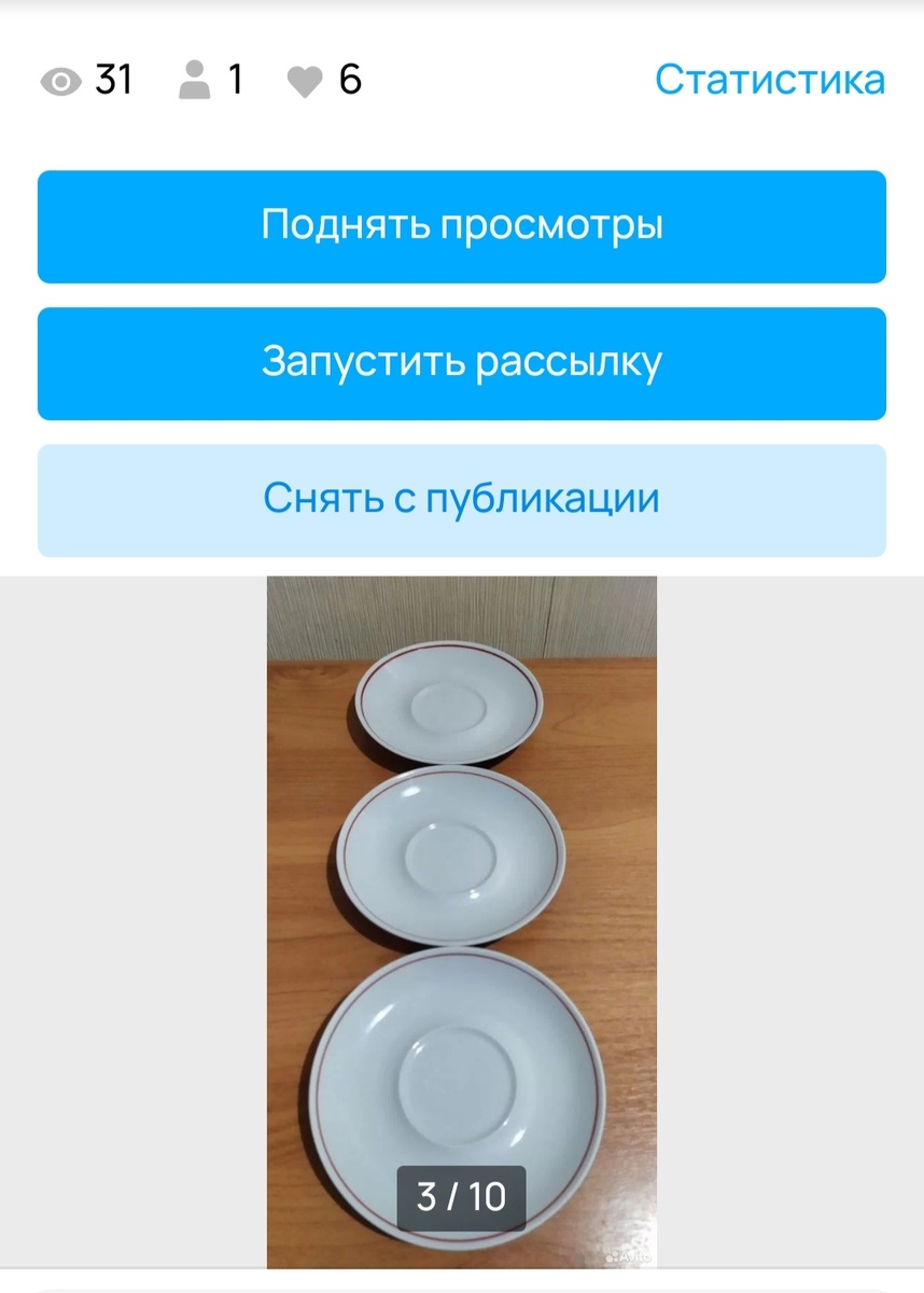 Доброго здоровья читающим . Продались блюдца. Блюдца из серии " Не смогла удержаться". Закупочная цена одного блюдца - десять рублей . Эти блюдца сделаны на Полонском фарфоровом заводе в семидесятые годы. Целые, без трещин и сколов. Выставила три блюдца за двести рублей. Заказ пришел быстро, отправила я быстро, а забирал покупатель долго, но все же забрал. Главное, результат. Хорошая продажа. Из семи блюдец, купленных для перепродажи, продано четыре.