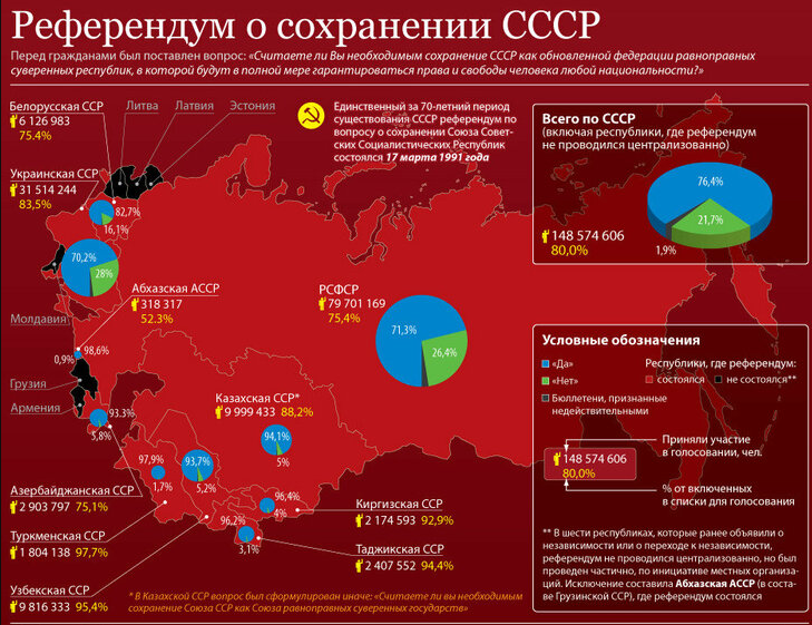 17 марта... Главным событием в этот день в нашей истории, безусловно, является то, что случилось в 1991 году... 17 марта 1991 года состоялся Всесоюзный референдум о сохранении СССР как федерации равноправных республик. В референдуме из 185,6 млн. граждан СССР с правом голоса приняли участие 148,5 млн. (79,5%), из них 113,5 млн. (76,4%) высказались за сохранение СССР.