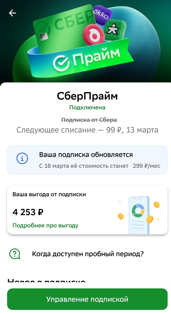 Подписка СберПрайм от Сбера с 18 марта подорожает до 299 руб/мес, а это значит что возможности экономить на подписке становится более востребованными. Зачем вообще этот СберПрайм? Для пока ещё рабочей стузинг-схемы реквизиты Финуслуг. Для меня важно что есть лимит в 500 тыс руб/мес на переводы без комиссии. А без будет 1% максимум 500 руб за перевод. Также категорий кэшбэка больше и самого кэшбэка. Есть ещё куча ништяков которые мне не нужны. Как можно экономить? Купить годовую подписку за 1999 руб/год или найти предложение на сторонних площадках вплоть до 999 руб/год. Это не всегда бывает нужно и удобно. Как стал поступать я? Просто иду и начинаю отключать подписку. Мне сначала предлагают платить за счёт бонусов СберСпасибо. Нажимаем на "Отменить подписку" и видим такое предложение: Подтверждаем нажатием на кнопку "Воспользоваться скидкой". И следующий месяц у вас со скидкой в 50 % и более того теперь у вас сначала будут списываться бонусы СберСпасибо, а уже после ваши деньги!