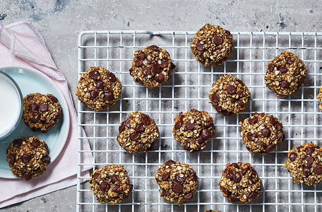 Это жевательное мягкое печенье с шоколадной крошкой не содержит яиц, масла или муки, что делает его идеальным угощением на один укус для всех. Секрет в использовании бананового пюре для связывания овсянки и кусочков шоколада в этой супер простой выпечке. Разомните 2 больших спелых банана в миске вилкой до однородной массы. Добавьте 150 г овсянки, чтобы она хорошо покрылась бананом, затем добавьте 100 г молочного шоколада (измельчить в крошку). Столовой ложкой выложите 16 шариков теста. Выложите на большой противень, застеленный бумагой для выпечки, оставляя зазор между каждым печеньем, так как они немного растекутся при выпечке. Аккуратно прижмите и придайте печенью грубую круглую форму. Выпекать при 190°C, конвекция 170°C в течение 18 минут или пока печенье не станет хрустящим и золотистым. Печенье должно быть все еще слегка мягким и жевательным внутри. Остудите на решетке. Вам нужно всего три ингредиента, чтобы сделать это простое угощение. 2 больших спелых банана,