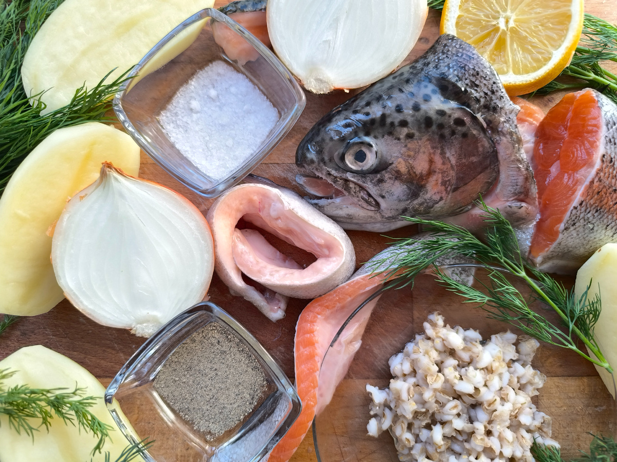 Посуда и инвентарь: суповая кастрюля, небольшая кастрюлька для варки перловой крупы, сито для промывания крупы, промывания готовой перловки и процеживания рыбного бульона, большая миска или кастрюля,куда процеживать бульон, разделочная доска, поварской нож, картофелечистка, шумовка, тарелка для разбора сваренной рыбы, небольшая миска для разобранной рыбы (плюс ещё одна для рыбных брикетов), ложка для помешивания, мешочек для отходов и мусора.