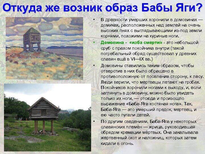 Есть мнение, что образ избушки Бабы-Яги — собирательный: она олицетворяет одновременно усопшего предка и жрицу, которая занимается организацией погребального обряда.