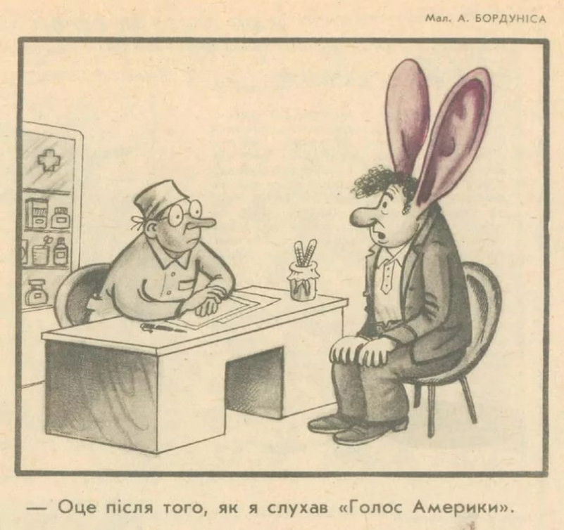 Рисунок из советской печати, высмеивавший «Голос Америки» и его простодушных слушателей
