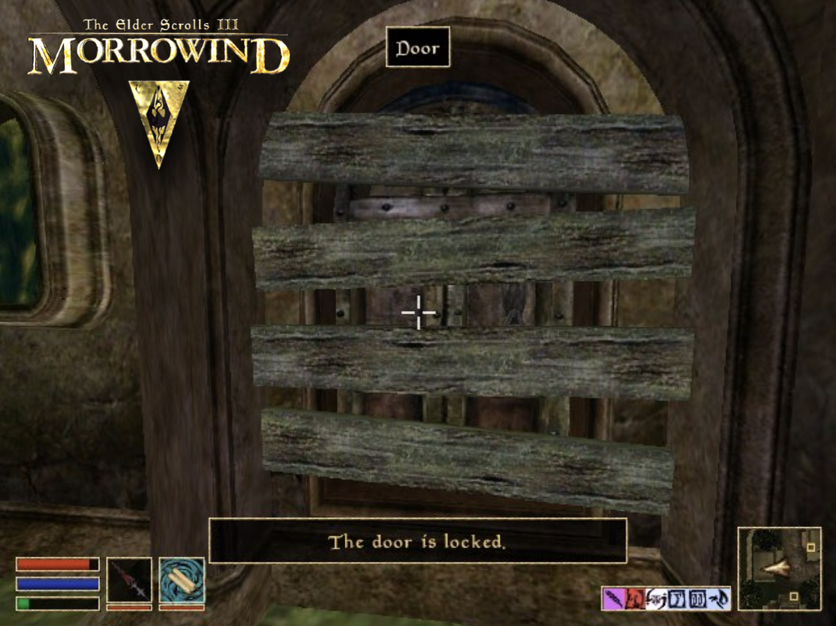 Люблю Morrowind в том числе и за неочевидные и, казалось бы, бесполезные механики. Но бесполезные они только пока вы не найдёте им применение — в этом и кроется одна из причин огромного количества возможностей игры. В школе «Изменение» имеется эффект «Открыть», когда мы можем с помощью заклинания взломать сундук или дверь. Однако существует и противоположный эффект — «Запирание», когда герой может закрыть дверь или сундук. NPC вскрывать замки не умеют, а других живых игроков в мире не существует — Morrowind не онлайн-игра. Так зачем нам нужен запор? Во время своего прохождения я не обращал на Запирание никакого внимания — там было ещё много бесполезных, на мой взгляд, заклинаний, созданных чисто для смеха. Однако теперь я повзрослел и понимаю его эффективность. Прежде всего, это ультимативное средство для прокачки навыка Безопасность: запираем любой сундук в укромном месте и методично его вскрываем. Заклинание стоит всего одну единицу маны, так что заколдовывать ларец можно много-много