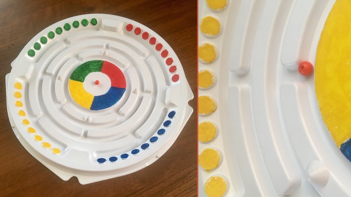 Показываю, как быстро, просто, подручными средствами сделать симпатичную игрушку. Моему внуку понравилось! Купили торт и съели торт, Осталась упаковка. Чтоб превратить её в игру, У нас ведь есть сноровка! Заметим, что по форме низ На лабиринт походит, - И шарик ловкая рука По лабиринту водит… Одним путём его ведёт, Потом другим обратно. Не так проста эта игра, И школьнику занятно! Раскрасим зоны по краям, Чтоб было интересней По лабиринту мяч водить, И поиграем вместе! Если Вам попалась упаковка от торта с такими канавками, похожими на лабиринт, превратите её в игрушку. Найдите подходящий по диаметру шарик, который будет достаточно свободно катиться по канавкам. У меня это бусинка. Нет бусинки – посмотрите в магазине в отделе пуговиц, часто их можно купить поштучно. Подобрав шарик, уже можно играть. Поместите его в центре круга. Держа упаковку двумя руками, слегка наклоняя её, постарайтесь провести шарик по канавкам задуманным путём. Чтобы чётко формулировать игровую задачу и украсить