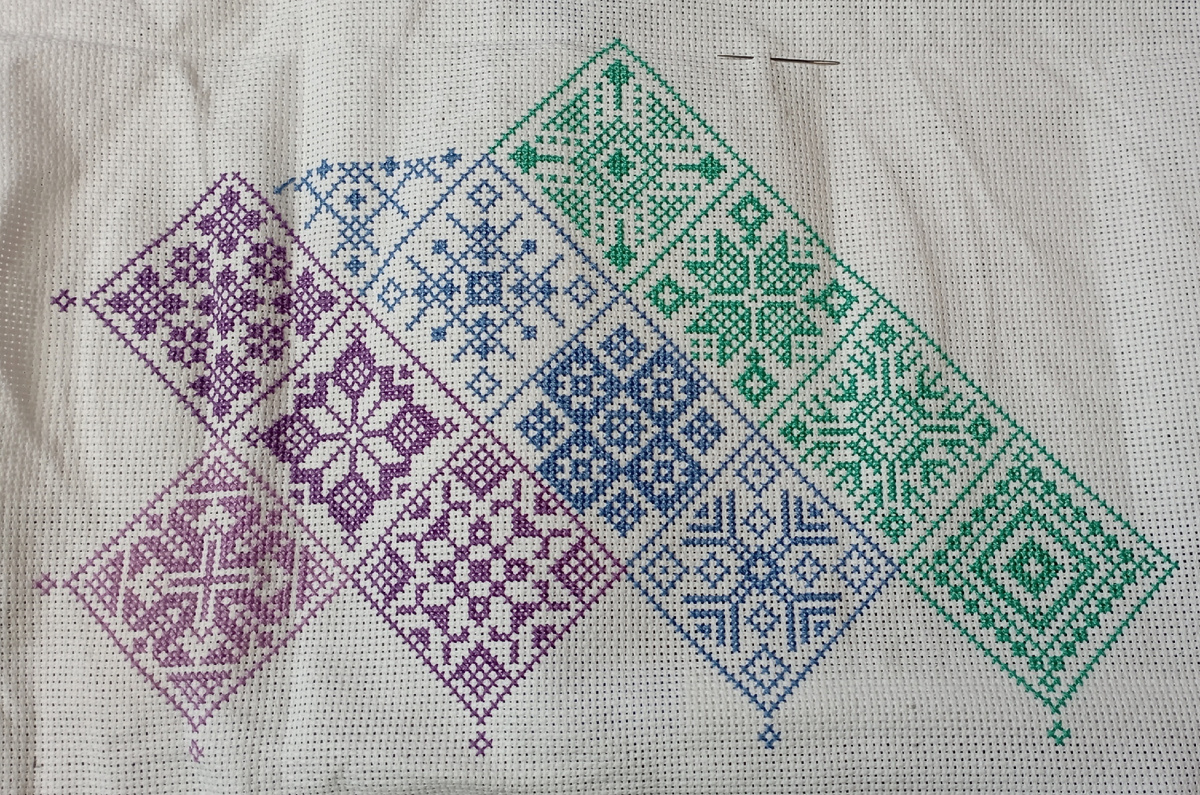 Очень понравился орнамент.Решила,что будет подушка, поэтому взяла канву 14 каунт,нитки гамма...на равномерке это смотрелось бы нежно,но пусть будет просто канва😊
