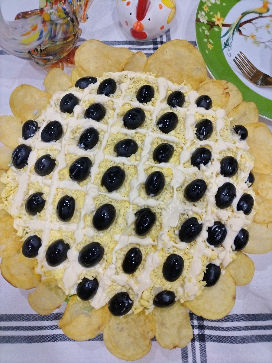 Попробуйте приготовить на праздничный стол - нежный и яркий салат "Подсолнух". Рецепт салата "Подсолнух" имеет множество разновидностей. Предлагаю очень интересный вариант - с печенью трески. Уверенна, ваши гости будут в восторге! Готовится салат из доступных продуктов. Все ингредиенты выкладываются слоями и сдабриваются майонезом.