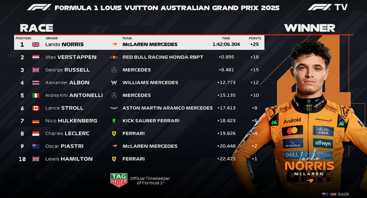 Чтош, Макларены показали свой темп, как фавориты, а Ферстаппен все же смог приехать вторым. Так что сезон будет точно не без борьбы. Феррари в свою очередь устроили шоу, только с другими актерами. Трижды упустив возможность заехать на пит стоп вовремя, при том обоими машинами. Эти ошибки освободили командам "средней" группы большие очки. Албон смог приехать, аж четвертым, но у него вся гонка шла очень хорошо. А вот Хюлькенберг и Стролл очень угадали, когда заехать в пит стоп, чем обеспечили себе очки на пол сезона вперед. Stake опережают Ferrari... Очень жаль Пиастри, который шел по пятам напарника (Норриса), но в их совместном вылете с трассы не смог поймать болид. Но все равно пару очков забрал, что радует. Самым большим шоком, лично для меня стал результат Мерседеса, который мог остаться с Макларен на равне. Штраф, кстати, в 5 секунд аннулировали, после протеста команды.