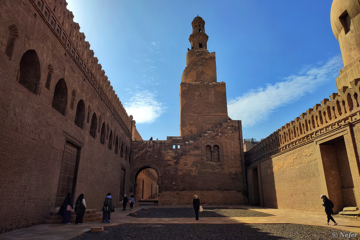 Мечеть Ибн Тулуна построена по образу и подобию Большой мечети в иракской Самарре, где в юности жил Ахмед ибн Тулун. Оригинал я видела, захотелось посмотреть каирский минарет и сравнить. Я поставила метку на карте, вдруг меня занесет в Каир. И вот, я здесь. Мечеть Ибн Тулуна расположена в историческом квартале Исламский Каир. Это старейшая из сохранивших свой первоначальный облик мечетей в Египте. В 1979 году объект внесен в список Всемирного наследия ЮНЕСКО. Проход в мечеть условно бесплатный. Официально билеты не продаются, однако, служитель на входе начинает рассказывать насколько это значимый объект, что это историческое наследие и все такое. Типа наденьте бахилы и дайте бакшиш. Если даешь слишком мало, он не соглашается, начинает стыдить, мол, это покрывает только расходы на бахилы, пожертвуйте на содержание. Сошлись на 50 фунтов за двоих, это примерно 100 рублей. Внутренний двор обрамлен арочными галереями. В центре двора расположен фонтан с бассейном для омовений, над которым в