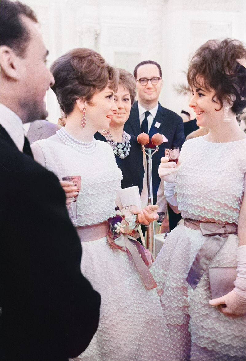 Встреча двух знаменитостей произошла в июле 1961 года на торжественном приеме в Кремлевском дворце в честь открытия II Московского международного кинофестиваля. Элизабет Тейлор и Джина Лоллобриджида пришли на прием в одинаковых белых платьях, расшитых жемчугом. Отличались платья только поясами. Когда две кинодивы встретились, растерялись все, даже министр культуры Екатерина Фурцева. Все замерли и ожидали грандиозного скандала. Надо отдать должное актрисам, они даже не подали вида, что что-то в этой ситуации не так. Обе кинодивы были на тот момент очень популярными. По прибытии в Россию их поселили в разных гостиницах: «Метрополь» и «Москва». Но не кинофестиваль их волновал в тот момент, а совсем другое . Они мечтали познакомиться с первым космонавтом мира Юрием Гагариным, который в апреле 1961-го совершил знаменитый полет. Джина попросила Екатерину Фурцеву познакомить ее с Гагариным. Встреча состоялась в Министерстве культуры, а потом они гуляли по ночной Москве. Лоллобриджида