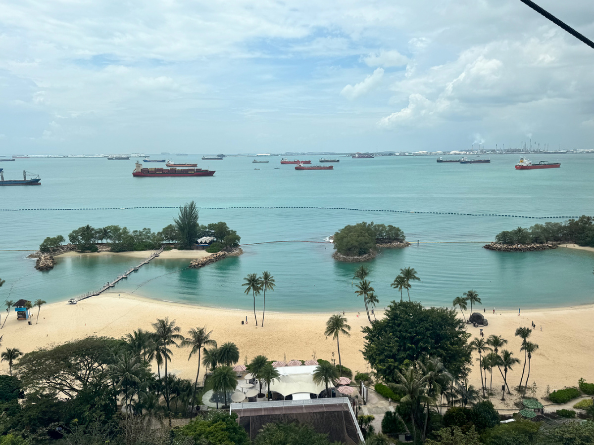Как я уже писала, на острове есть пляжи. Мы по ним не гуляли, но, так как в наш билет на канатную дорогу входил проезд по острову, мы с радостью прокатились над ним и осмотрели всё с высоты. Честно говоря, желания полежать на таком пляже у нас не возникло, несмотря на то, что даже в пасмурную погоду температура держалась на уровне 30–32 градусов. Всё дело в том, что в море было множество кораблей, и это создавало странное ощущение. Мне, например, совсем не хотелось лезть в эту воду. Но это, конечно, мои личные "тараканы" — у каждого свои предпочтения! 😜