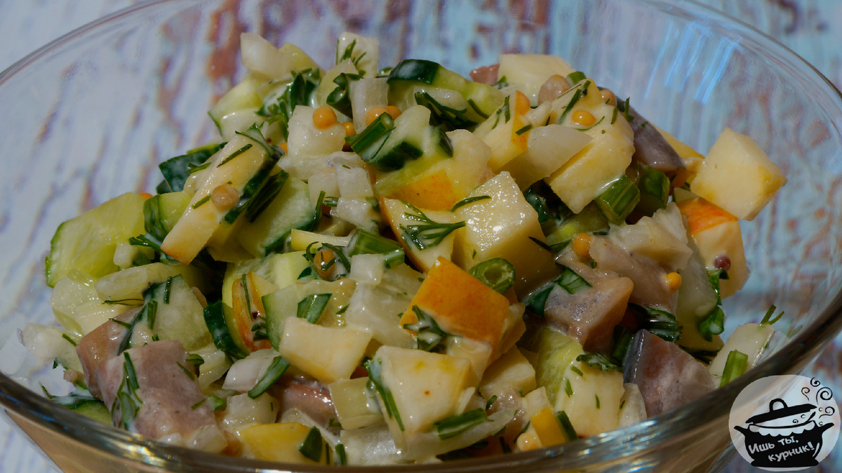 удалить семечки из яблока, нарезать небольшим кубиком. Сельдь, огурец и лук мелко порезать. Зелень измельчить. Смешать все ингредиенты, заправить горчицей, сметаной и солью.