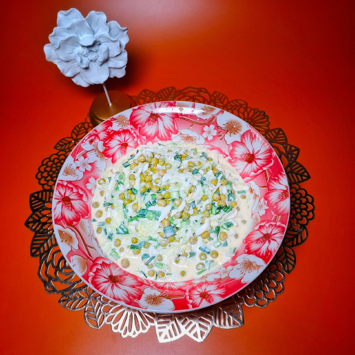 Сделала салат с яйцами, зеленым луком, творогом, консервированным горошком и огурцом. За счет пустившего сок огурца салат вышел жидковат. Но - уж какой получился. Вообще он был вкусный. Потянул на 440 калорий.
