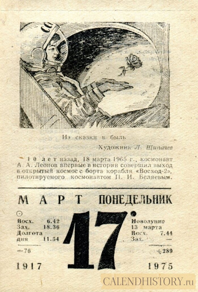 Художник Л. Щипачев 10 лет назад, 18 марта 1965 г., космонавт А. А. Леонов впервые в истории совершил выход в открытый космос с борта корабля «Восход-2», пилотируемого космонавтом П. И. Беляевым. *** Оборотную сторону листка этого календаря можно посмотреть у нас по ссылке на сайте. Другие листки советских календарей смотрите у нас на сайте - CALENDHISTORY.ru ПОСМОТРИТЕ ЕЩЁ ЛИСТКИ ОТРЫВНЫХ КАЛЕНДАРЕЙ: