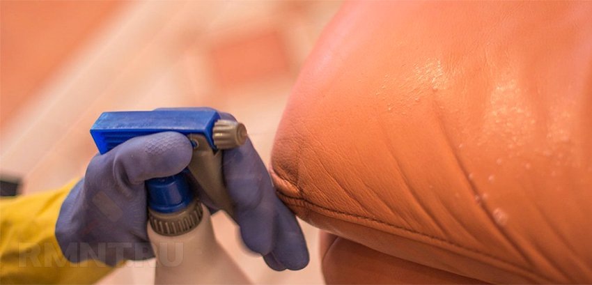 Специальные чистящие средства для кожи, обычно предлагаемые в мебельных салонах, достаточно эффективны и справляются почти с любыми бытовыми загрязнениями, никоим образом не повреждая обивку. Если под рукой такого средства нет, можно пробовать все имеющиеся под рукой вещества, кроме агрессивных кислотных или щёлочных чистящих средств, обычного аптечного спирта, абразивных чистящих и составов с красителями или сильно выраженной ароматической отдушкой.