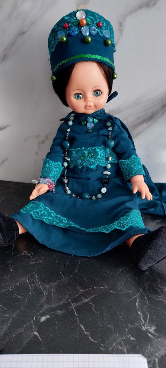 Так вот прямо с кукольного наряда я и начну. Дошили мы , наконец-то всё. Куклу одели, ботиночки черные для нее я сшила, волосы черные искусственные мы сделали, даже бусы в цветах и оттенках малахита и изумруда у нас нашлись.