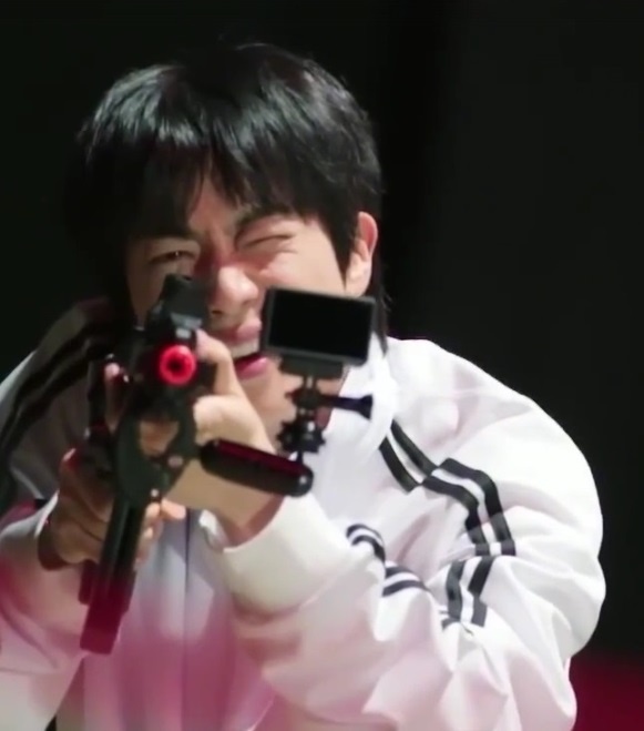 Продолжается "Игра в кальмара" все с теми же участниками - Шин Сынхо, Сон Донпё и Нам Чанхи: Как вы уже поняли, четвертая игра - это "Камень-ножницы-бумага": Игра простая, но правила были какие-то сложные - я так их и не поняла! На фотке видно, что на столе лежат пластиковый молоток, синий тазик и жестяной поднос - за какие-то промахи игроки бьют друг друга по головам молотком, а тазик и поднос - чтобы прикрывать голову. Но лупили и тазиком, и подносом. Лучше всех было Донпё в маске кальмара - она его защищала. Команда Джина выиграла и защитила 600000 очков. Пятая игра - "Красный свет – зеленый свет". Мы в такую играли в детстве - "Тише едешь" называлась. Ведущий читал считалочку: "Тише едешь - дальше будешь, а приедешь - все забудешь! Раз, два, три - стоп!" На "стоп" надо было замереть, а если кто пошевельнулся - вылетал. Кто добрался до финиша - выиграл. Но здесь игрокам еще надо было на финише стрелять по мишеням, а передвигаться приходилось под скандирование стаффа: "Красный - зе