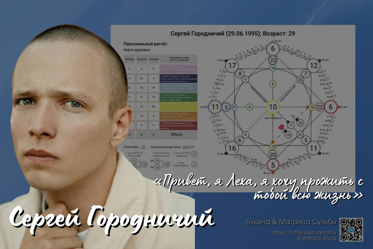 разыграл моё любопытство, что за персонаж такой, эта Ника Здорник. Вот девчонка меня и зацепила)). меня и правда твой разбор разжег любопытство))) Такой отклик получил прошлый мой разбор Ники Здорик (Кати Орловой) сподвиг многих на просмотр сериала, а меня на разбор её партнёра=мужа по фильму Сергея Городничего (Лёхи Данилина). Сергей Городничий 29 июня 1995 г Детство актёра прошло в Купчино, в криминальном районе, где можно было купить наркотики, где бегали с пистолетами. На лицо 15 аркан кармического хвоста. Как и в целом актерская карьера проходит также по этому же аркану. Для того, чтобы отгородить сына от всего это безобразия, родители записали его на тхэквондо (11 аркан). Занимался он им с 7 до 14 лет, дошёл до Олимпиады, но всё изменила травма позвоночника. Спортом заниматься запретили, но в школе стали приглашать на мероприятия. Ему понравилось и пошёл дальше (16 аркан зоны финансов - новое на месте разрушенного - тут он явно в плюсе у Сергея). Рассказывая о своей нынешней дев