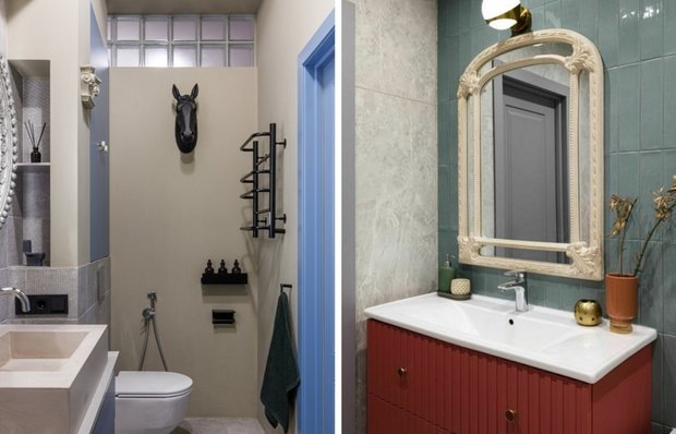 Мебель и декор в ванной зоне насыщены яркими акцентами. Уголок для хозяйственных нужд с включением стиральной машины и яркой красной тележки для белья стал практичным и стильным решением. Винтажное зеркало в классической бежевой раме акцентирует внимание на уникальных деталях интерьера и служит стильным декоративным акцентом, создавая органичное сочетание современности и этнического шика.