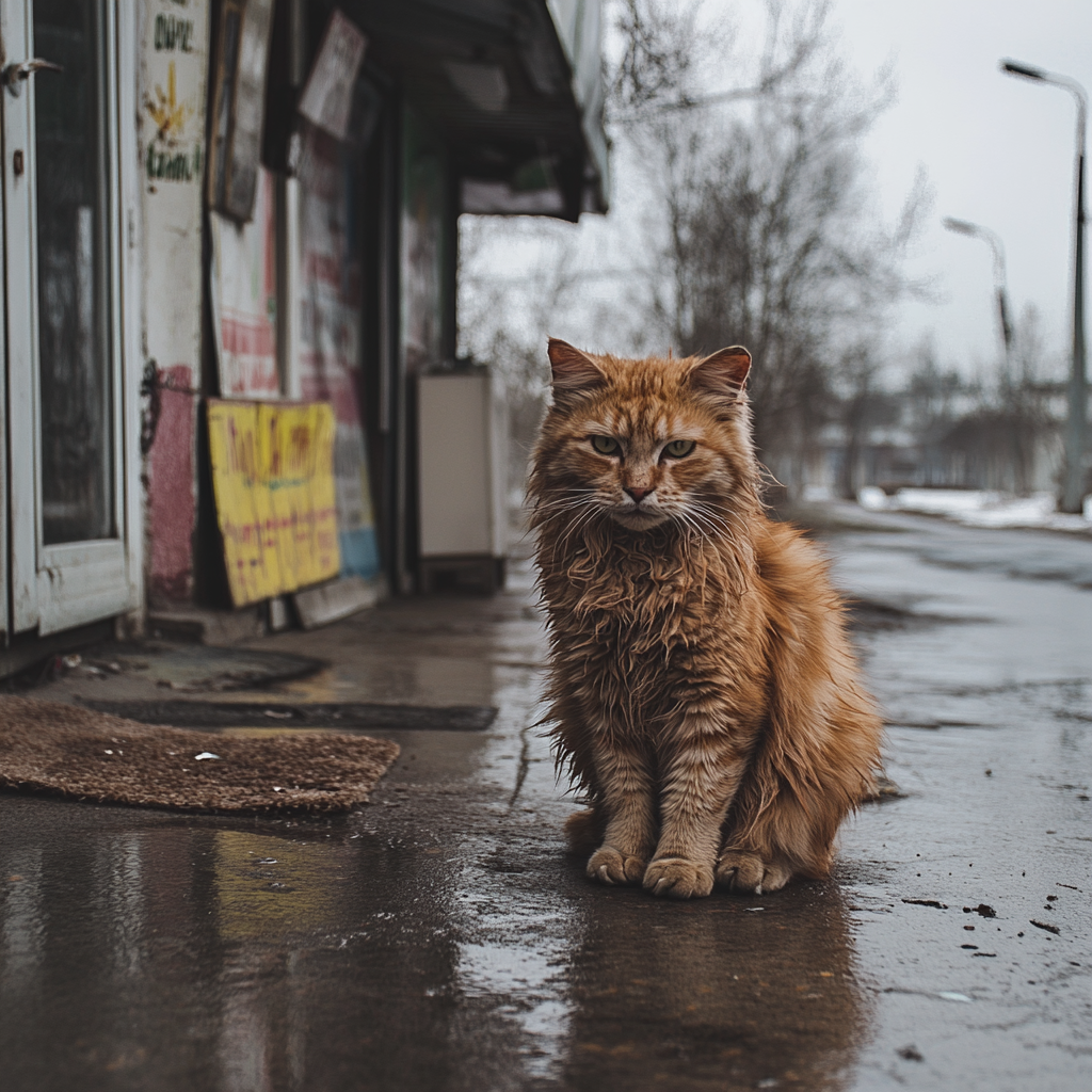 Утром кот так и сидел около крыльца магазина, как будто и не уходил всю ночь.