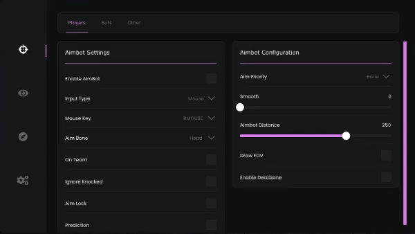 - Aimbot — автоматическая наводка на врагов. Ваш прицел сам "прилипает" к цели, даже если она движется.