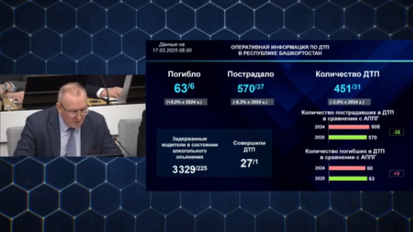 С 10 по 16 марта в республике произошло 31 ДТП. За прошедшую неделю, с 10 по 16 марта, в Башкирии произошло 31 ДТП. Об этом на оперативном совещании в ЦУР РБ сообщил и. о. министра транспорта и дорожного хозяйства РБ Виктор Жульков. В авариях пострадало 37 человек, погибло шесть человек. Смертельными стали четыре столкновения и два наезда на пешеходов. С начала года на дорогах республики произошло 451 ДТП. Жертвами ДТП стали 63 человека, пострадало 570 человек. Напомним, одно из смертельных ДТП произошло 16 марта в Кушнаренковском районе — молоковоз столкнулся с грузовым тягачом. Погиб водитель грузовика. Фото: ЦУР РБ.