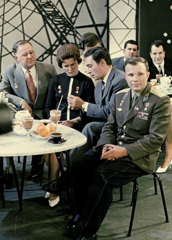 На фото – Юрий Гагарин, Вячеслав Тихонов, Валентина Терешкова и Иван Любезнов. Герои космоса и кино собрались в Центральной студии телевидения. Терешкова пьёт кофе, Тихонов что-то рассказывает, а Гагарин спокойно наблюдает за беседой. Тёплая и непринуждённая атмосфера.