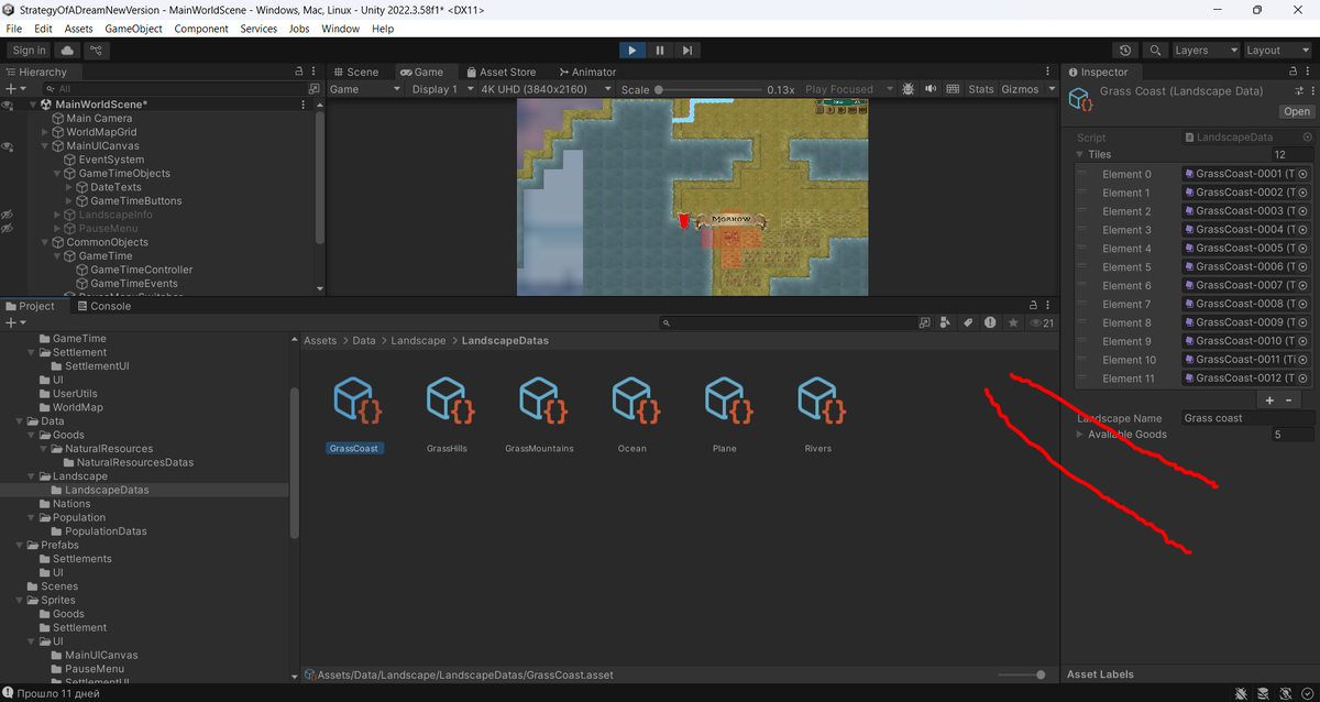 Разработка стратегии мечты – TileData. Создание свойств тайлов. Приветствую, дорогие друзья! Продолжаем работу над нашей глобальной стратегией. В этой публикации мы зададим нашим тайлам свойства. Смысл в чем – каждый вид тайла на карте мира будет определенным типом ландшафта, у каждого ландшафта свои ресурсы, свойства – истощение, скорость передвижения и так далее… Как нам это сделать?! Нам необходимо создать ScriptableObject – using UnityEngine; using UnityEngine.Tilemaps; [CreateAssetMenu(menuName = "Landscape/LandscapeTiles/LandscapeTypes", fileName = "NewLandscapeType")] public class LandscapeData : ScriptableObject { public TileBase[] Tiles; public string LandscapeName; public Goods[] AvaliableGoods; } Что в нем хранится – поле TileBase[] Tiles это массив тайлов которые присущи данному типу ландшафта, название ландшафта и ресурсы (С ресурсами разберемся в следующих публикациях. Далее мы создаем наши типы ландшафта и назначаем ему тайлы – Вот так у нас выглядит травяной берег – А