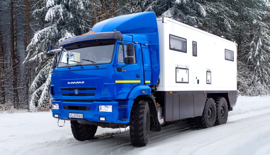 Пресс-служба КАМАЗа опубликовала фотографии нового дома на колёсах, построенного на полноприводном грузовом шасси. Сайт Wroom.ru изучил конструкцию этой машины. Эту машину сделал не сам КАМАЗ, а нижегородская компания «Волгатрейд», занимающаяся постройкой домов на колёсах и другой специальной техники. Этот экземпляр изготовили по индивидуальному заказу для семьи из четырёх человек. За основу взяли трёхосное шасси полноприводного грузовика КАМАЗ-43118, но у него растянули колёсную базу и улучшили отделку кабины. Двигатель остался стандартным — это турбодизель мощностью 340 л. с. Вместительный жилой модуль вмещает в себя всё необходимое для долгих и комфортных путешествий: двухспальную кровать, дополнительные раскладывающиеся задние места, кухню и санузел с душем. Автодом оборудован по полной программе: здесь есть газовая плитка, мойка, холодильник, микроволновка, диван, множество шкафчиков, телевизор, обеденный стол и даже дровяная печь-камин со съёмным дымоходом! Ещё одна особенность м