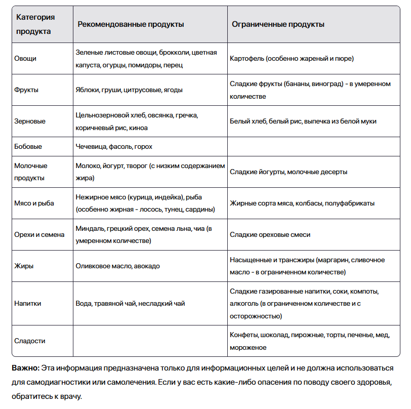 - 🍺 Алкоголь: Употреблять в умеренном количестве и с осторожностью, так как он может влиять на уровень сахара в крови.