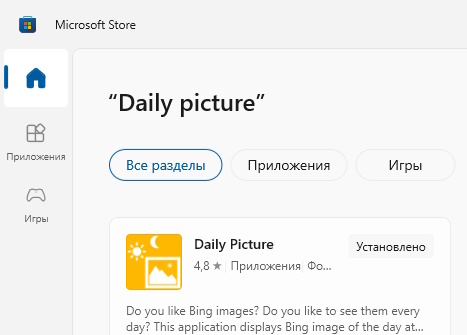 Причина, по которой это могло произойти носит системный характер. Например, очистка реестра могла что-то стереть; изменения в политиках могли закрыть доступ к функции «Windows: интересное». Это может быть связано с языком интерфейса, который Вы используете. Например, если язык Windows переключить в английский США, то заработает приложение Кортана и вероятнее всего и функция Windows: интересное. В любом случае это – ограничение, и наша задача его обойти. 1. В панели задач экрана выберем иконку Microsoft Store. Требуется войти в свой аккаунт Microsoft Store, кажется используя pin-код для входа в систему. 2. Вверху, в «Поиск приложений…» запишем: Daily Picture, нажмем Enter. У меня это приложение уже установлено поэтому открытая страница выглядит так: У Вас откроется страница установки приложения, в которой Вы выберете кнопку «Установить». После установки программы нужно сделать следующее: 3. Кнопка «Пуск», вверху «Недавно добавленные» > Daily Picture.