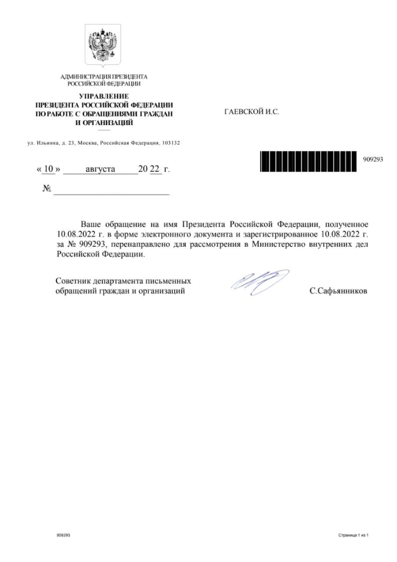 - Ваше обращение на имя Президента Российской Федерации, полученное 10.08.2022 в форме электронного документа и зарегистрированное 10.08.2022 за №909293, перенаправлено для рассмотрения в Министерство внутренних дел Российской Федерации.