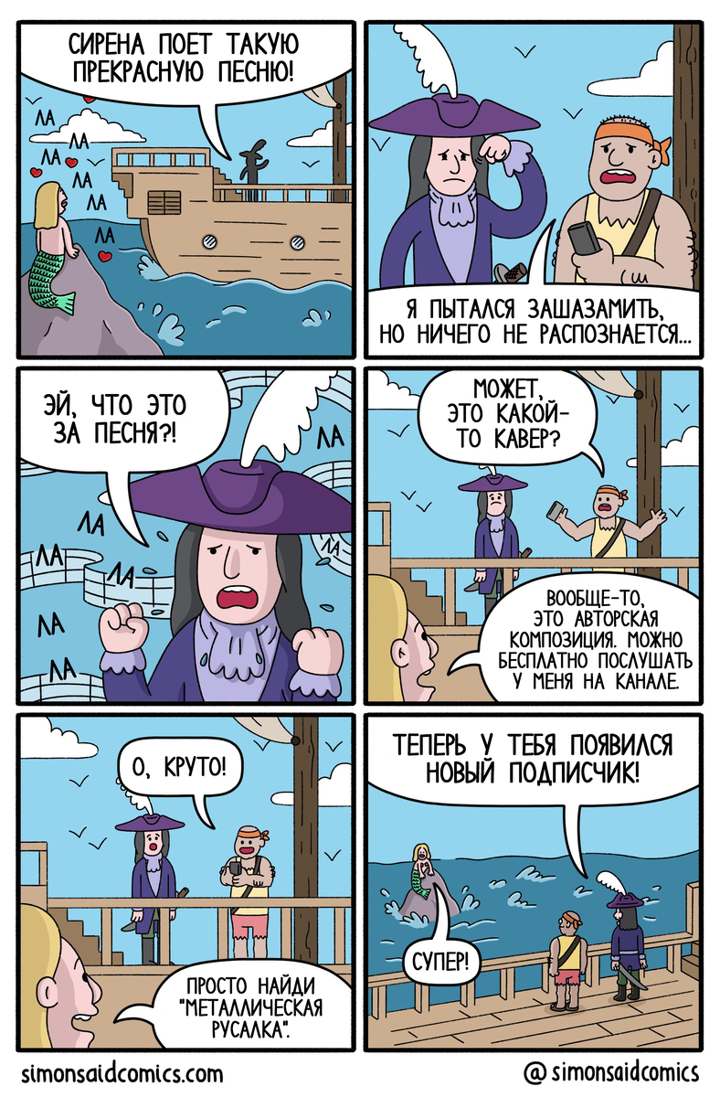 Иногда может показаться, что на какую-то конкретную тему - особенно, если она довольно узкая - уже давно все пошучено. На практике - это редко бывает правдой, потому что даже на самую специфическую тему всегда находятся все новые и новые шутки. Взять хотя бы русалок - уже и про ноги (и их отсутствие) было шуток полно, и про их ракушковую одежду, и про все остальное, но авторы комиксов все равно продолжают придумывать что-нибудь новенькое. Это подтверждается, как минимум тем, что в этом блоге - это уже далеко не первая подборка про русалок. И, я уверен, будет еще. Американский художник Саймон Джонсон (Simon Johnson) работает над многими проектами - рисует комиксы и иллюстрации, создает сайты и выполняет заказы для разных компаний. Смешные комиксы для интернета он тоже делает - его серия называется Simon Said («Саймон говорит») и представляет из себя набор забавных зарисовок на разные темы. Есть в том числе и кое-что про русалок. Американский художник Харрис Фишмен (Harris Fishman) - соз