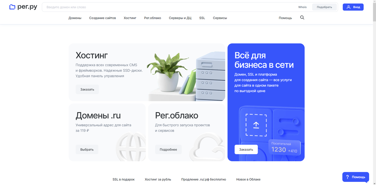 Для того чтобы вы могли стать полноценным владельцем сайта нужно разместить его на хостинге. В настоящее время многие иностранные ресурсы заблокированы, вследствие этого произошло перераспределение рынка хостинг-провайдеров на рынке России. Сегодня мы рассмотрим 3 самых популярных хостинга для размещения своей страницы в интернете. Они занимают почти весь рынок и предоставляют широкий функционал по сравнению со своими конкурентами. Рег.ру является самым многофункциональным хостингом в РФ. Помимо базового функционала, такого как SSL (делает ваш сайт безопасным, ссылка меняется с http на https) и подключение домена, хостинг предоставляет возможности конструкторов сайтов и дополнительный функционал для бизнеса. За последние 6 лет он является лидером по покупке доменов, что делает его абсолютным лидером на рынке Beget находится на втором месте по популярности в России после Рег.ру. Провайдер предоставляет самый большой тестовый период в сравнении с конкурентами - он составляет 30 дней, за