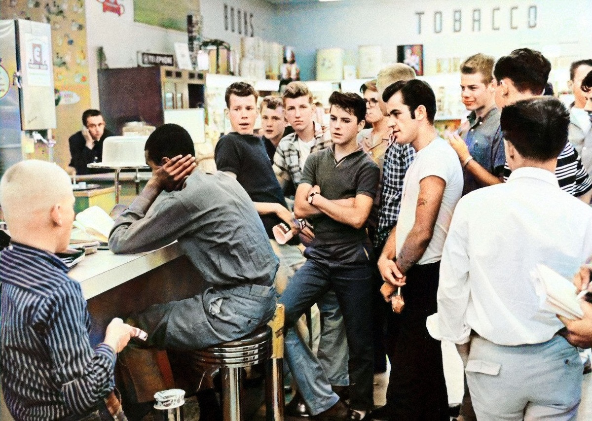 На фотографии один из первых баров для смешанного посещения. Действия разворачиваются в Вирджинии, США, 1958 год. В 1958 году была законодательно отменена расовая сегрегация в школах и некоторых общественных местах. Формально её отменили, а на практике все выглядело как на фотографии. Чернокожих обступала толпа белых и пыталась выгнать, оказывая давление.