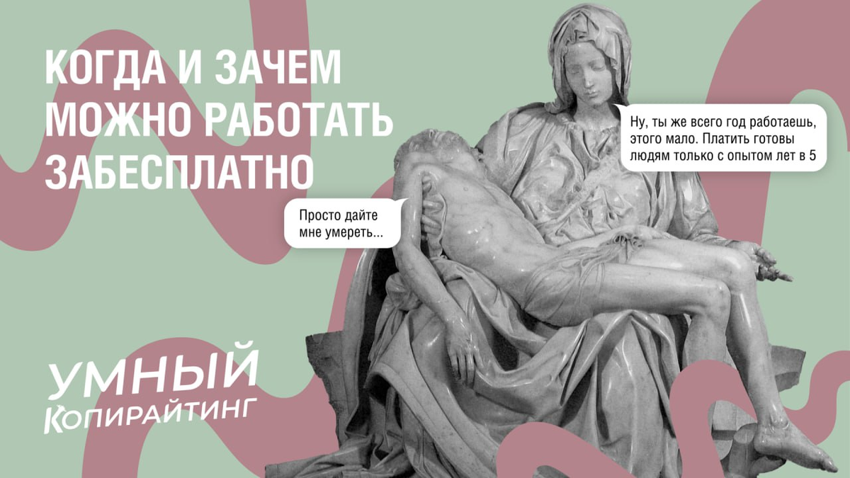 Привет, друзья! Это #СашаХейтова. И ей больно. Сейчас я много взаимодействую с новичками в копирайтинге и ужасно страдаю оттого, что 99% обожает себя недооценить и понабирать задач за 0 рублей. Ну боятся у нас люди еще говорить о деньгах, не знают, как назвать цену ¯\_(ツ)_/¯ Если вы новичок. Или если вы не новичок, но чувствуете, что вам не доплачивают. Прочтите этот пост. Совпало что-то из списка ниже — можно успокоиться и не ждать денег на карту. В остальных случаях — ноги в руки и переговариваться об оплате. Итак. Работать за бесплатно можно, если: 1. Клиент — НКО, а вы хотите сделать доброе дело. Например, запустить серию рассылок, чтобы собрать на корм бездомным собачкам. Сомнительно (НКО обычно ищут не волонтеров, а оплачиваемых сотрудников), но все равно похвально. 2. Работа принесет профит, более значимый, чем деньги. Это когда вы новичок-новичок, вам нужно написать свой первый в жизни коммерческий текст, а подруга-маркетолог предложила набить руку на ее проекте. После дадут х
