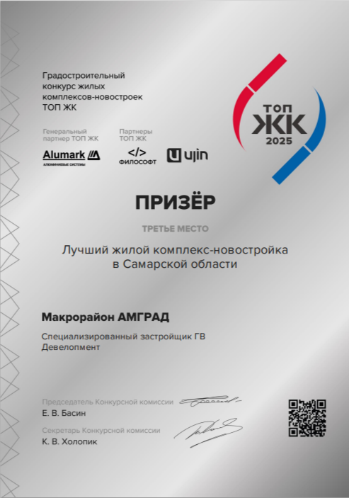 Макрорайон «Амград» отмечен наградой федеральной премии «ТОП ЖК-2025», организованной порталом Единого реестра застройщиков. «ТОП ЖК» — самая масштабная в России премия жилых комплексов-новостроек, которая проводится с 2020 года. Наш проект занял третье место в номинации «Лучший жилой комплекс-новостройка в Самарской области». За победу боролись 11 жилых комплексов региона. Каждый ЖК оценивался по целому ряду параметров, например, инфраструктура для автомобилистов, дворовое пространство, безопасность, инженерные системы, среда для маломобильных граждан, энергоэффективность и многое другое. Большинство из них заимствованы из Стандарта комплексного развития территорий, разработанного Минстроем России и ДОМ.РФ. В оценке приняли участие более 600 независимых экспертов, рекомендованных некоммерческими объединениями строителей, проектировщиков, застройщиков. В состав жюри вошли руководители ключевых общероссийских некоммерческих объединений в строительной сфере, научных организаций. Председ