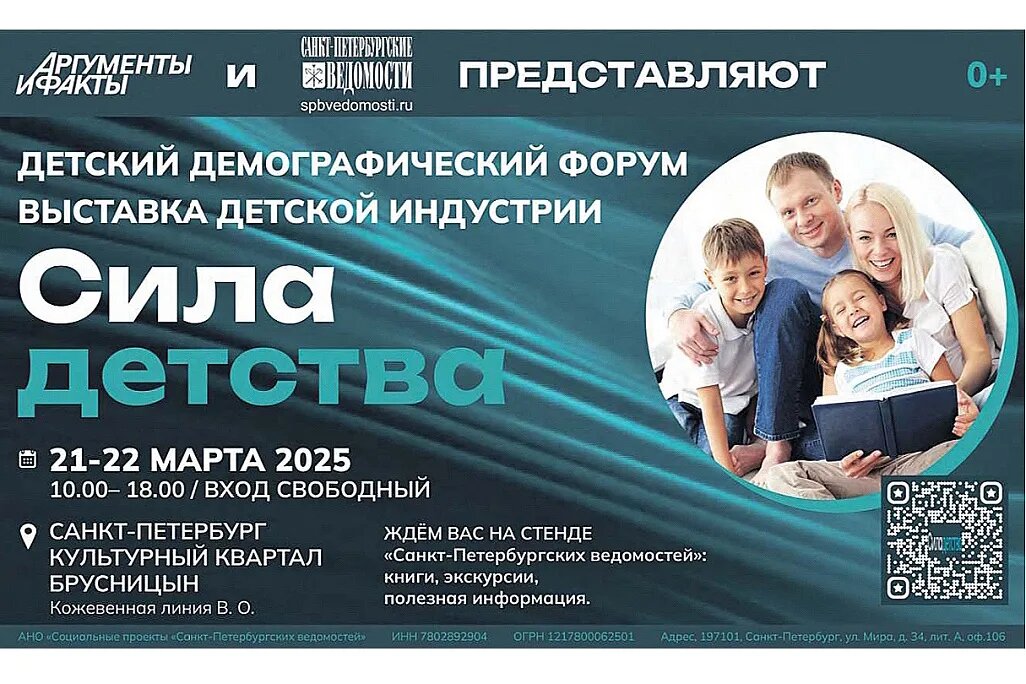 Приглашаем родителей, молодые семьи и пары, планирующие детей, на стенд газеты «Санкт-Петербургских ведомостей» на выставке детской индустрии «Сила детства» (0+). Она пройдет 21-22 марта 2025 года в культурном квартале «Брусницын» (Кожевенная линия, 30). Мероприятие состоится при активном участии и информационной поддержке главной городской газеты. Помимо газеты «Санкт-Петербургские ведомости» в выставке «Сила детства» примут участие представители ведущих компаний в сфере детского досуга, медицины, образования, семейного туризма. Вас ждут выступления более 25 специалистов в секции для родителей, которые поделятся полезными советами и практическими рекомендациями. - Лекции специалистов - врачей, психологов, педагогов и социальных работников - о том, как сохранить здоровье ребенка, как правильно развивать малышей и выстраивать отношения с подростками. - Консультации по поводу семейных льгот и выгодных предложений для всей семьи. - Мини-выставка с товарами и услугами для детей. - Мастер-к