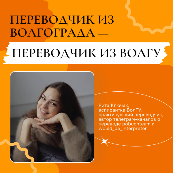 В рубрике кафедры теории и практики перевода и лингвистики «Переводчик из Волгограда — переводчик из ВолГУ» интервью с выпускницей Маргаритой Ключак, переводчицей, автором телеграм-каналов о переводе pobuchteam и would_be_interpreter.
