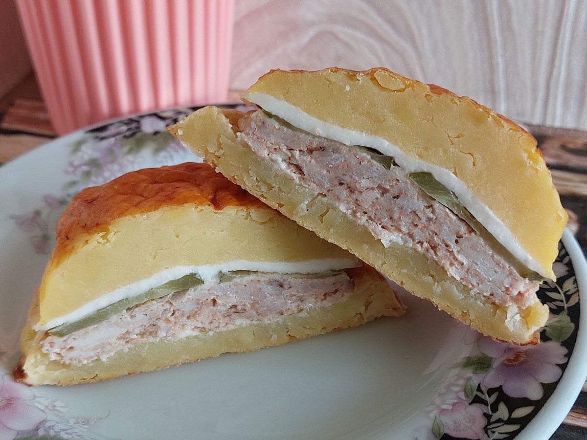 Далее начинаем готовить. Но прежде подготовим противень. Противень застелаем пергаментом, смазываем его подсоленным маслом. Из картофеля лепим низ будущей булочки размером как булочка для гамбургера Далее смазываем картофельную булочку майонезом. Далее лепим из фарша котлету, чуть меньше чем картофельная булочка и укладываем ее на нее. Далее режим соленый огурчик кружками и укладываем на котлетку. На огурч
