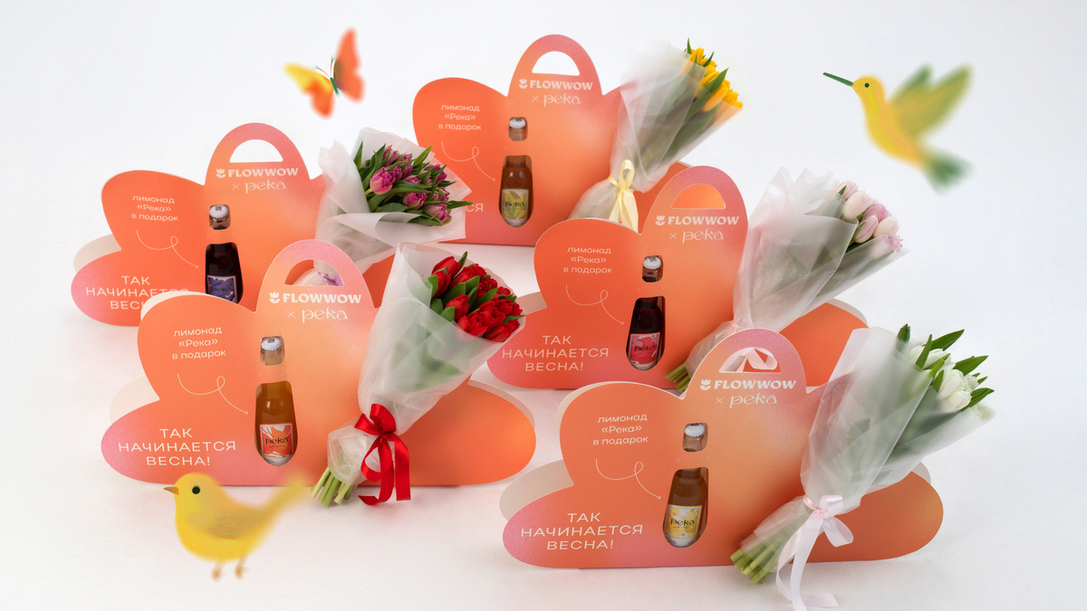 Что получится, если объединить два классных бренда, 500 бутылок лимонада и ассортимент семи цветочных студий? Перед праздничным пиком продаж Flowwow объединился с брендом лимонадов «Река» и создал лимитированную серию букетов с напитками в подарок. Рассказываем, как прошла коллаборация и чем полезен такой формат. В четырех городах — Москве, Санкт-Петербурге, Екатеринбурге и Казани — наши амбассадоры-селлеры предлагали покупателям эксклюзивные букеты с лимонадом от «Реки» в стильной упаковке. Подарочные боксы оформили так, чтобы композиция выглядела цельной: сумка-облако в теплых весенних оттенках дополняла букет. Готовые наборы отсняли на фотосессии — получили не только контент, достойный Недели моды в Париже, но и качественные фотографии для карточек товаров на Flowwow. Затем фирменные боксы отправились к амбассадорам Flowwow. В коллаборации участвовали селлеры из четырех городов: 1. Покупатели оценили идею необычного презента. Фирменные боксы с цветами и лимонадом привлекли внимание